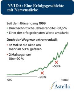 Die Idee ist simpel: Man kauft gute Aktien und hält sie langfristig. Kurzfristige Schwankungen spielen weniger Rolle – auf Dauer geht es meist nach oben. Beispiel NVIDIA Wer 1999 10.000 USD in NVIDIA investiert hätte, hätte heute über 48 Mio. USD. Der schwierige Teil Auf dem Weg dorthin: