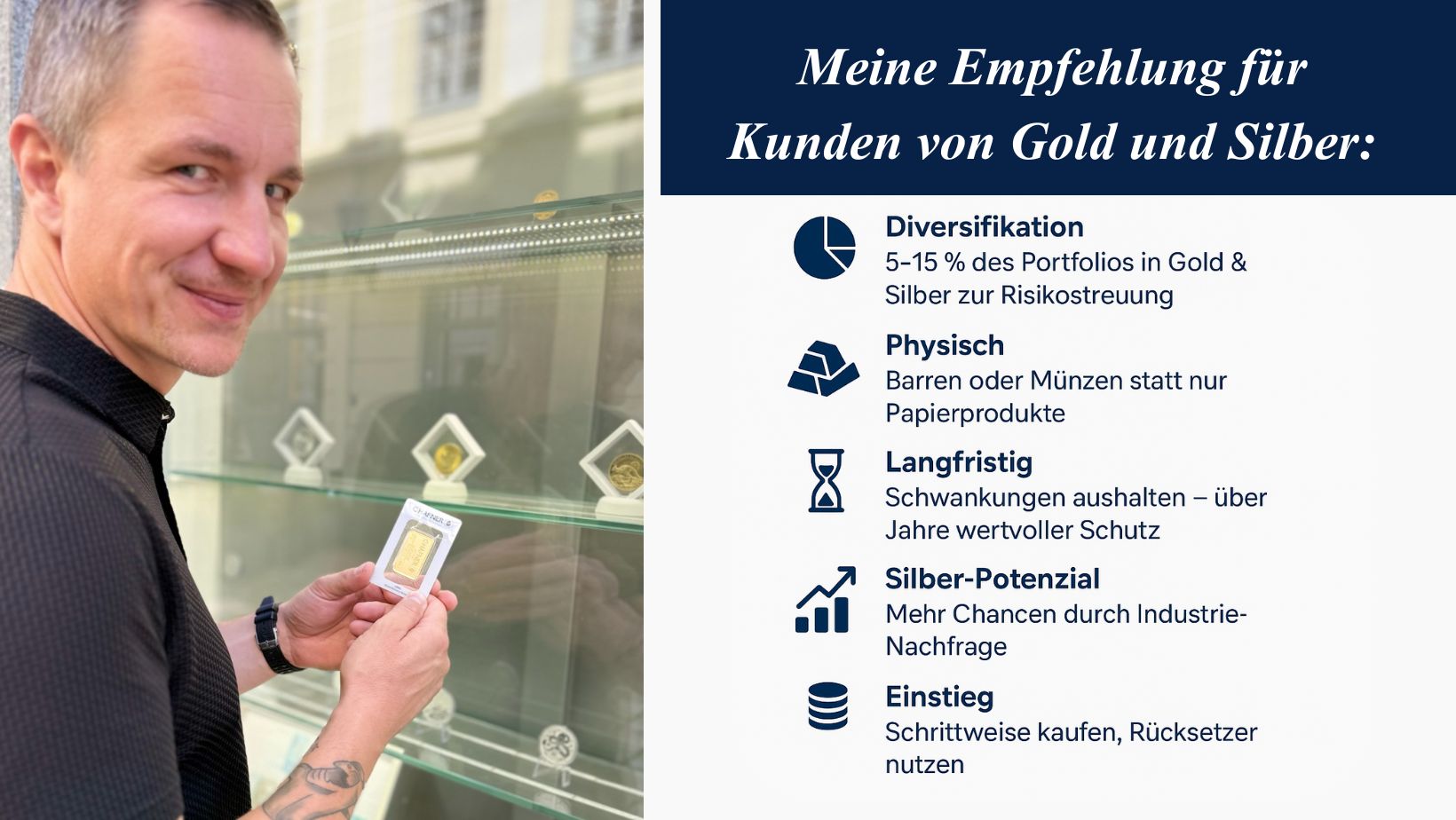 Diversifikation: 5–15 % des Portfolios in Gold & Silber als Schutz vor Risiken.
